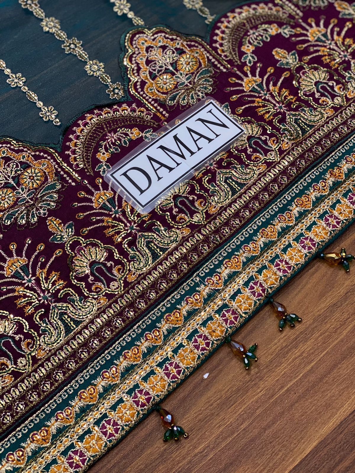Front: Fully embroidered with sequence detailing and attached daman tassels