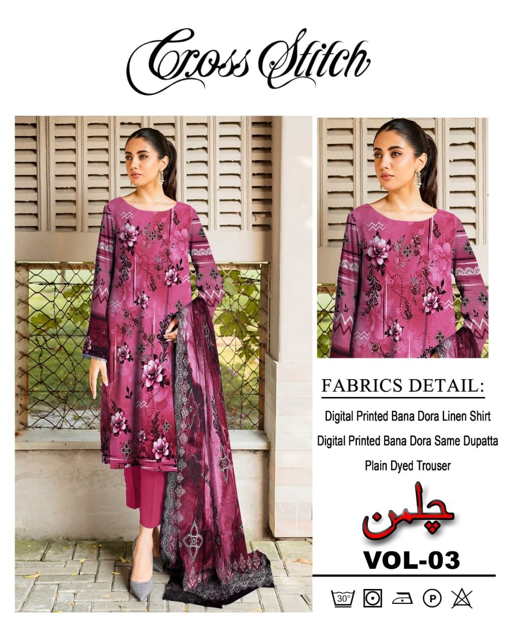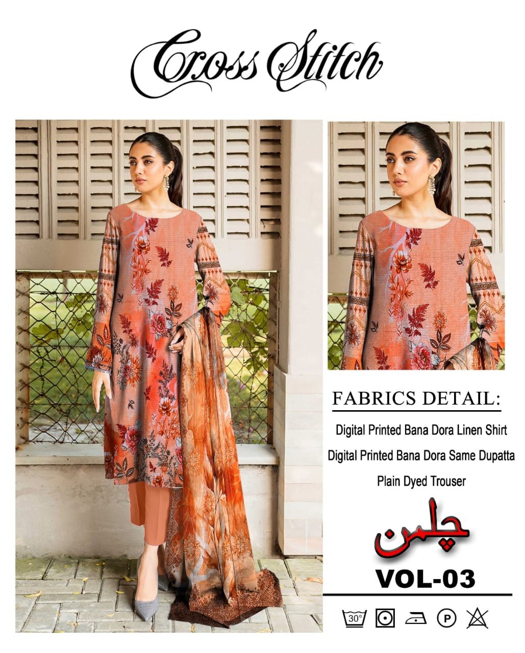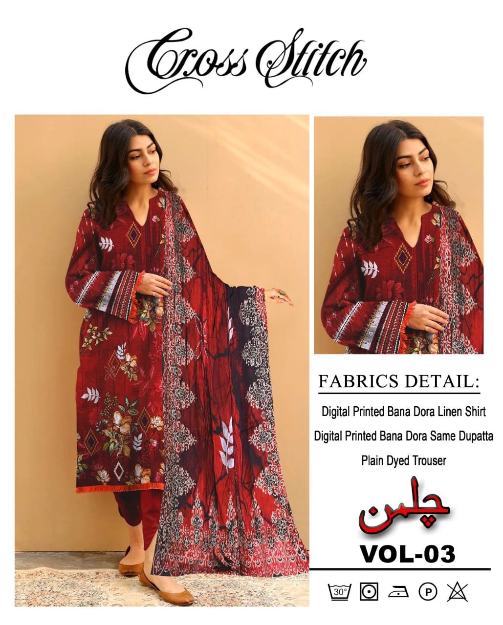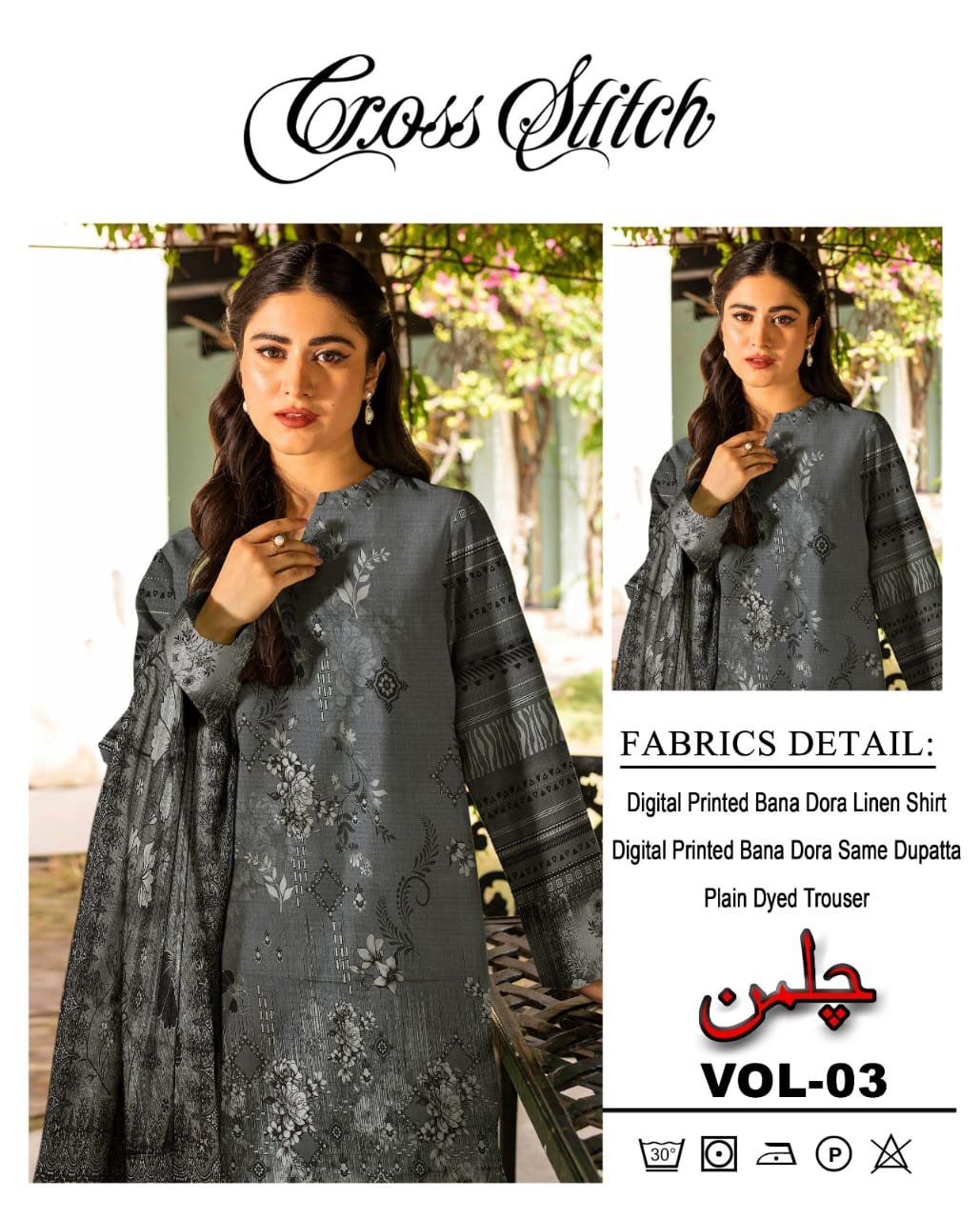 Bring a touch of elegance to your wardrobe with the Cross Stitch Chilmaan Collection, beautifully designed on premium Bana Dora fabric. This 3-piece digital printed suit offers a graceful balance of comfort and sophistication — perfect for daily wear or semi-formal gatherings. 🌸